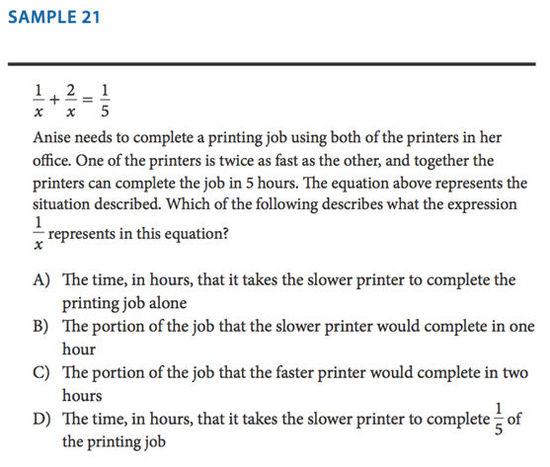 从今天公布的新SAT的26道样题来看,并未发现哪道题需要运用微积分,但是等式,方程,表达式确实更复杂了,这是新老SAT数学部分的另一差别。这一部分的典型样题为: